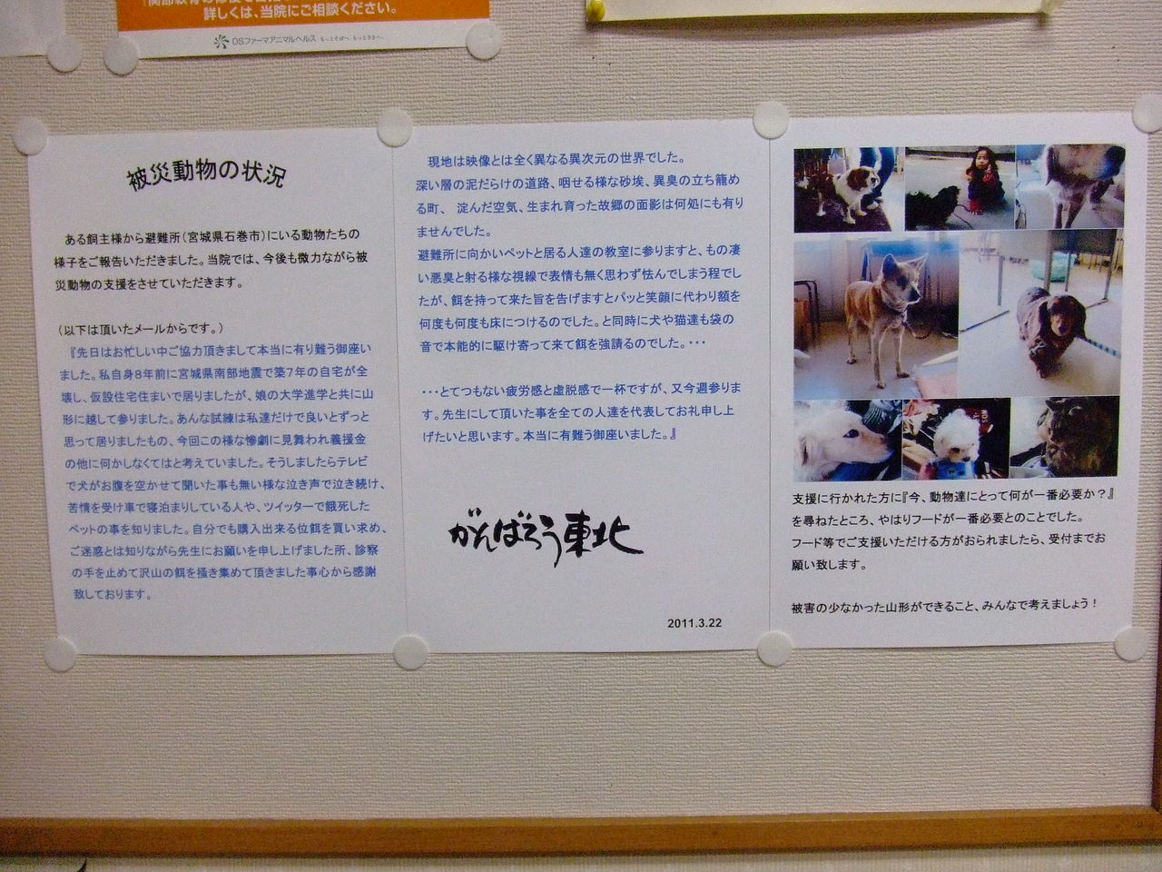 被災地の皆様の笑顔と一日も早い復興を心よりお祈り申し上げます。 そして、被災したペットや生き物たちの、少しでも多くの命が守られてほしいと願っています。 同じ一飼い主として・・・。 今、私たちに出来る事・・・。 一人一人の気持ちや想いが集まれば、大きな力・形となって届けられるのではないでしょうか。 つい先日、当病院に来ていただいてる飼い主様から避難所(宮城県石巻)にいる動物たちの様子をご報告いただきました。 その、内容をブログや待合室に掲示させていただいたところ、他の飼い主様からの問い合わせも何件かあり、当院からの物資も含め、徐々に増え始めています。 http://livedoor.blogimg.jp/teramura_ac/imgs/1/4/14784f65-s.jpg http://livedoor.blogimg.jp/teramura_ac/imgs/2/a/2ac73d49-s.jpg ドッグフードやキャットフード、ペットシーツや猫砂・タオル・消臭剤など。本当にありがとうございます!!! 当院では、今後も微力ながら被災動物の支援をさせていただきます。フード等でご支援いただける方がおられましたら、病院受付までお願いいたします。 http://livedoor.blogimg.jp/teramura_ac/imgs/0/f/0f37f8cc-s.jpg がんばろう東北!!! テレビなどの報道で見てはいましたが、実際に目にされた人の文は強烈です・・・・