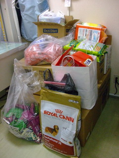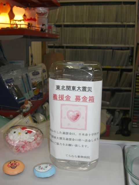 2011年03月21日助けてください!震災から10日が過ぎました。 ここ山形は、太平洋側に比べれば被害は少なくすみました。 ガソリンや食料が手に入り難いなど不便な生活をしてはいますが、 今後それも少しずつ改善される模様です。 しかし、依然として太平洋側では、大変な生活をされている方が 沢山いらっしゃいます。ワンちゃんやネコちゃんもそうです。 先週、本院の患者さんがご夫婦で来院されました。 被災地にいる動物のために今から現地に向かう旨を告げられました。 そして、フードがあればいただけないかとおっしゃられました。 診察でバタバタしていたので、急いでサンプルフードなどを ダンボールと紙袋に詰めてさし上げました。 ご夫婦は、深々と頭を下げられ被災地に出発されました。 以下のメールは、その患者さんが下さったものです。 先日はお忙しい中ご協力頂きまして本当に有り難う御座いました。私自身8年前に宮城県南部地震で築7年の自宅が全壊し、仮設住宅住まいで居りましたが、娘の大学進学と共に山形に越して参りました。あんな試練は私達だけで良いとずっと思って居りましたもの、今回この様な惨劇に見舞われ義援金の他に何かしなくてはと考えていました。そうしましたらテレビで犬がお腹を空かせて聞いた事も無い様な泣き声で泣き続け、苦情を受け車で寝泊まりしている人や、ツイッターで餓死したペットの事を知りました。自分でも購入出来る位餌を買い求め、ご迷惑とは知りながら先生にお願いを申し上げました所、診察の手を止めて沢山の餌を掻き集めて頂きました事心から感謝致しております。 現地は映像とは全く異なる異次元の世界でした。 深い層の泥だらけの道路、咽せる様な砂埃、異臭の立ち籠める町、 淀んだ空気、生まれ育った故郷の面影は何処にも有りませんでした。 避難所に向かいペットと居る人達の教室に参りますと、もの凄い悪臭と射る様な視線で表情も無く思わず怯んでしまう程でしたが、餌を持って来た旨を告げますとパッと笑顔に代わり額を何度も何度も床につけるのでした。と同時に犬や猫達も袋の音で本能的に駆け寄って来て餌を強請るのでした。・・・ ・・・とてつもない疲労感と虚脱感で一杯ですが、又今週参ります。先生にして頂いた事を全ての人達を代表してお礼申し上げたいと思います。本当に有難う御座いました。 http://livedoor.blogimg.jp/teramura_ac/imgs/8/d/8d21ed49-s.jpg http://livedoor.blogimg.jp/teramura_ac/imgs/a/f/afe6c508-s.jpg http://livedoor.blogimg.jp/teramura_ac/imgs/d/6/d616e7e8-s.jpg 人を救うのが精一杯で、動物たちまで手が回らないのです。 今日、院長と二人でホームセンターで消臭剤やペットシーツなどを 購入しました。 ご夫婦が、また向かわれるそうなのでフードと一緒にお渡しします。 何もかも、まだまだ足りません。(特にフードが足りないとのことです。) 何かございましたら、ぜひお力になって下さい。 よろしくお願いします。 2011年03月22日募金箱を設置しました!院長の太一です。