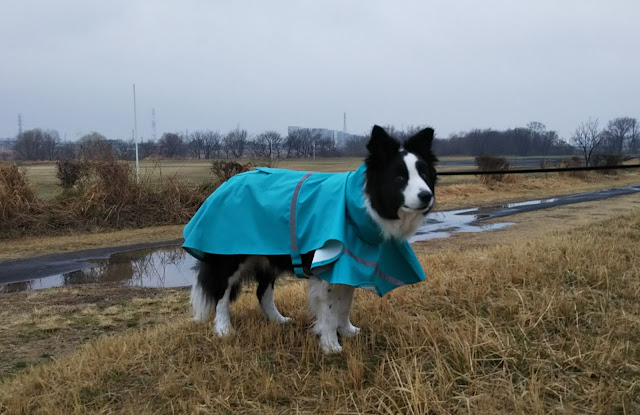 散歩に出掛ける前に家の中でレーンコートを着せらると、ランディはキョトンとしています(上の写真)。 <小雨の中を散歩@多摩川河川敷公園 2019年2月28日17:07> 夕方、車でいつもの多摩川河川敷公園に行って、雨の中を散歩をしました。レーンコートを着ているので、びしょびしょにならず安心です。