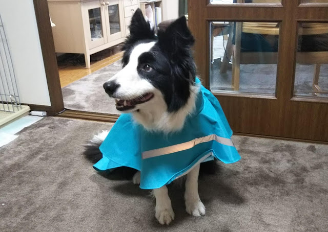 昨日、28日(木)は一日中雨だったので、夕方はランディにレーンコートを着せて散歩に行きました。