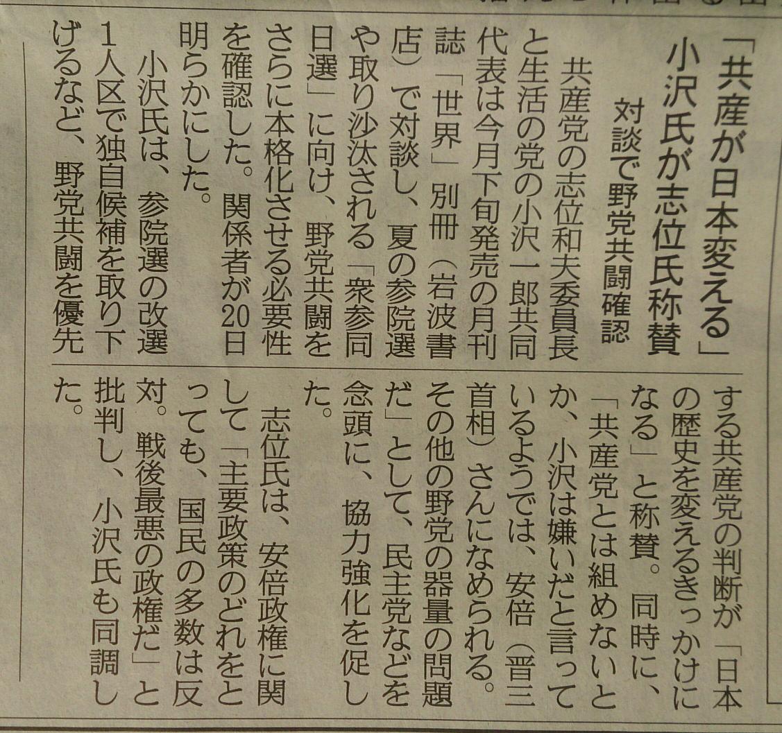 野党5党は今後も、自民・公明与党とその補完勢力に勝利し、安倍政権を打倒するため、各1人区で共闘実現の努力を続ける構えです。