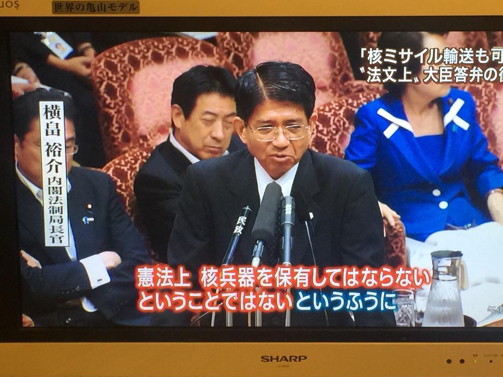 今日5日の特別委員会の質疑で、他国軍への後方支援を巡って、自衛隊による核ミサイルの輸送を「法文上は可能だ」と明言し、毒ガス兵器の輸送もできるとの、とんでもない見解を示したという。