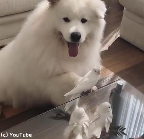 「う、動けない」…鳥に困ってる優しい犬がかわいいぞ!(動画)テーブルに片手を乗せ、じっとしているワンコ。 なぜ動かないのかというと……優しい行動が人気を呼んでいました。