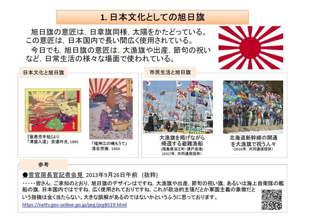 最近日本外務省はホームページで旭日旗について「自衛艦または部隊の所在を示すものとして、不可欠な役割を果たしてきており、国際社会においても広く受け入れられている」と主張した。