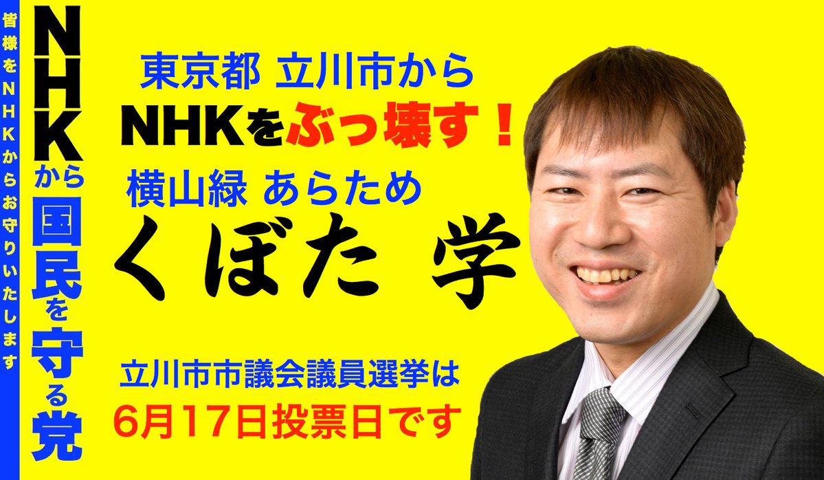 くぼた学は居住地である江戸川区平井に帰り!〜、 祝賀会と題した放送を行い浮かれ様子で配信を行っていたが、… 今後は公人(立川市議)となることから、特に在日や反日勢力の最大の守護者であるNHKを敵視している事で、多くの日本破壊分子から狙われ、週刊誌からもマークされる恐れがある。 地方自治体、立川市の一市議ごときを週刊誌が扱わないだろうと思うだろうが、市議でも数多く不正で報道されている例がある。 狙われるのは国会議員だけでなく、市議や区議も問題が多きければ週刊誌は血の匂いを嗅ぎつける群狼のように牙を剥き出し、涎を流して集まってくるでしょう。 横山緑ことくぼた学は!〜、 『群狼・粗大魔スゴミ!』のスクープにも負けない謎のメンタルを持っている!・・・ 『ニコニコ生放送⇔配信者』でネタにして配信する、まわりがどう思うかはおかまいなしなの強固な精神を備えている稀有な人物である。 『NHKから国民を守る党』が掲げている!〜、 NHKへのヘイト票が集まった事が市議選当選の最大の要因だった!・・・ つまり立川市の有権者の多くが 『NHKに不満を持っている!』との『天使の証明』となった観がある!・・・ 横山緑の純粋なファンで入れたという人もいるだろうが、数からしたらNHKへの不満で入れた数の方が多いでしょう。 ❮❮『街を良くする!』/『住みやすい街作り!』/『改革を!』/『子どものための』❯❯、など、耳障りが良いが、心が籠もってはいないマニフェストよりも!、… ❝❝ NHKをぶっ潰す!❞❞ とハッキリと分かりやすい党の方が注目されやすいという例である。 立川市ではNHKから国民を守る党、1人では!〜、 政策などを発議して市議会は取り上げてはくれぬ事が予測されるが、立川市議会が風通しが良くなるプラス効果が期待できる!・・・ 立候補前に『死刑を即執行すべき』と立川市とは無関係なことを言っていた くぼた学氏はが、今は多摩川の水質調査を行うなどの、地道ながら重要な事案に取り組んでいるとのことですが、好感が持てる人物ですね!。 因みに、立花孝志氏にはよからぬ風評があり!〜、