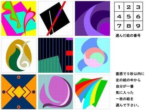 悩みが少なく、わんぱくで常にハッピーでいられる人。 自由で束縛されない生活を好む。座右の銘は 「人生は1度きり。僅かな時間でも人生をエンジョイをしたい」。 好奇心が旺盛で、新しい物事を積極的に受け 入れる一方、 変化を好むため拘束を嫌う。周りの環境は絶えず変化をしていると感じており、 その変化 に驚きと喜びを感じるタイプ。 2.自立・前衛的・束縛を嫌う 自立した性格で、あらゆる分野において前衛的。 自由を追求し、束縛されるのを嫌う。自分の生活空間を求めるタイプ。 芸術関係の仕事や趣味を持つことが多い。 自由な発想の持ち主で、時々人を驚かせることをやり出す。 生活スタイルもユニークで、流行を追い求めず、 自分のスタイルと信念を貫いて生きるタイプである。 3.自己反省・敏感・思想家 自己反省することが多く、また敏感な思想家で、自分や周りの環境に対して、 人よりうまく、しかも徹底 的にコントロールすることができる性格の持ち主。 表面的なものや浅はかなものを嫌う。他人と雑談するより一人でいるのを好むタイプだが、 友人と深い関わりを持つこともでき、精神的に落ち着いている。 長時間にわたり一人でいることが苦にならない。 4.堅実・頭脳明晰・調和 堅実で落ち着いており、頭脳明晰な人。普段の振る舞いは自然で、シンプルなことを好む。 このタイプが兼ね備える堅実さや落ち着きは、人に安心感を与え、 周りの人から尊敬される。また、低俗なものや華やかなものに興味がなく、 着るものは実用的なものを好む。ファッションや流行に対して興味を示さない。 5.プロフェッショナル・真実・自信 何事にもプロフェッショナルで、事実に基づいた真実を求める。 運命より自分の力を信じる自信家でもある。 現実的かつ簡単な方法で問題を解決し、日常生活のあるあらゆる物事に対して、現実的な見方を持ち自由に対応できるタイプ。 このタイプの性格の人には、周りも安心して仕事を任せることが多い。 意志が強く、目的に達成するまで継続して努力するタイプ。 6.温和・慎重・攻撃的でない 温和な性格で、物事に対しては慎重になるタイプ。 簡単に友達を作ることができ、また自分のプライベートの時間と空間を大切にする。時々、グループを離れて一人で静かに思考することを好むが、 決して 孤独が好きなわけではない。 自分自身に満足し、社会ともうまく付き合っていける性格。 7.分析力・リーダー・自信 人々が見逃しがちなことに対して敏感に反応し、新たなことを発見することを好む。身に付いた教養は日常生活においても現れ、 自分の持っている格調高い視点があり、ファッションや流行に惑わされない。 優雅で心地よい生活を理想としており、自分と接する人々も上品で教養のある人を好む。 8.ロマン・空想・情緒的 感性の強い持ち主。人生には夢がなければならないと考え、 ロマン主義を軽視する人や唯物主義の人を受け入れない。 如何なることも自分の豊かな感情と情緒を優先する。 9.活発・行動的・外向的 面白いことや多元性のある仕事を好む。 千篇一律の仕事や慣例を嫌い、人々の前で自分の得意なことを披露するのが好きなタイプ。 試合やコンテストに積極的に参加し、そういう活動に興奮を覚えるタイプ である。 http://news.livedoor.com/article/detail/4234955/ この9枚の画像は、海外の科学者や心理学者らが共同で研究し、何年もかけて作り上げたものだそう。世界中で何度も実験を繰り返し、図案の形や色を調整して、選び抜かれたものなのだとか。そしてこの9枚には、9つの異なる性格を隠されているんだそうです。