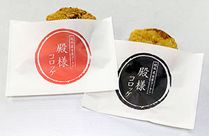 殿様コロッケは、名古屋コーチンを素材にしたうましお味とピリ辛みそ味の2種類で1個150円。名前やパッケージのデザインを同大の学生が考案した。殿様コロッケを使った「殿コロバーガー」(350円)も同時に発売される。