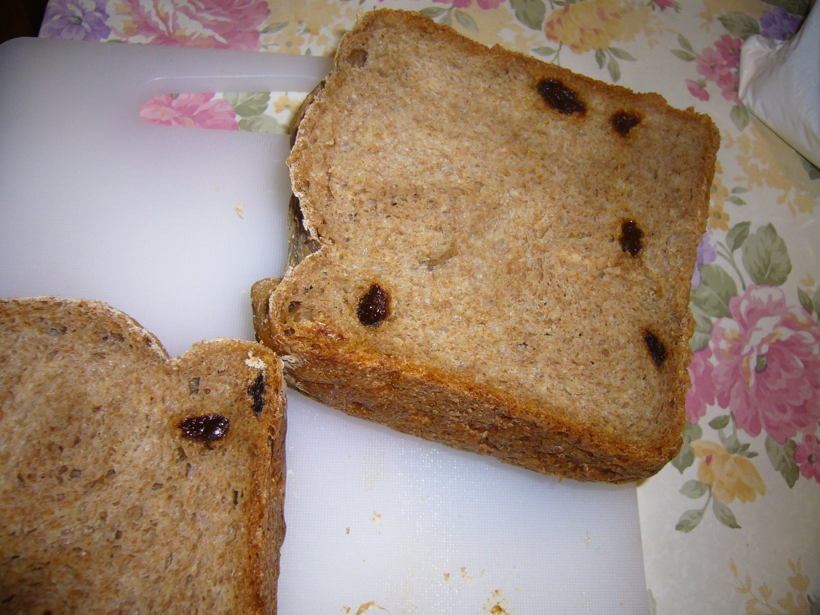 胚芽入り小麦粉を使って、レーズントーストを作ってみましたが、あまりうまくいかなかった。アメリカ製のレーズンが重過ぎて、doughに上手に混ざらなかったのと、糖分が高すぎるのか、発酵が過ぎて粗い歯ごたえになっていた。そして中に混じらなかったレーズンの糖分がカラメル化して、皮は黒くなった。