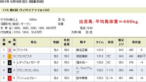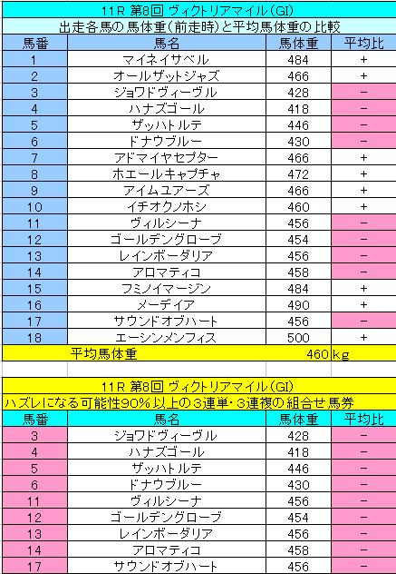 いつも通り、まずは馬体重での馬の絞込みを始めました。 出走18頭の平均馬体重(前走時)は460kg。 その中で、平均以下は 9頭(ピンク色で囲んだ馬)です。 http://livedoor.blogimg.jp/rie0708/imgs/2/8/28625379.jpg 表から、3,4,5,6,11,12,13,14,17番の馬が平均以下となり、 これら9頭だけの3連単・3連複は90%以上の確率でハズレとなります。 先日もブログでアップしましたが、馬体重が平均以上の馬が1〜3着の 中に2頭は入る可能性が高いです。 平均以下の馬は1頭ぐらいが、2着か3着に入るのが関の山かな。 ちなみに先週のNHKマイルでは1〜3着まで平均馬体重以上の馬が占めました。 また、2011年のヴィクトリアマイル(GI)では2頭が平均以上、1頭が 平均以下でした。(下の表) http://livedoor.blogimg.jp/rie0708/imgs/7/a/7a0156dd.jpg よって、今回のヴィクトリアマイル(GI)も平均馬体重以上の馬で実績のある 馬を2〜3頭選び、それを軸として馬券を買うのがベストと思われます。 絶対無いとは言えないけれど、平均以下の軽量馬だけの3連複・3連単 は買わないほうが良いでしょう。 ※ なお、馬体重は当日ので再計算してください。 http://stat.ameba.jp/user_images/20130123/11/club-ningin/1f/71/j/o0302006212388523782.jpg http://stat.ameba.jp/user_images/20130123/11/club-ningin/38/70/j/o0302006212388523783.jpg ご利用のメールソフトが起動しますので、件名に「無料メルマガ」と書いて 空メールをお送りください。 締め切りは毎週土曜日午前9時です。 当日(土曜日)と翌日の日曜日の2回分、無料でメルマガを配信させていただきます。 なお、人参クラブからは、お申込に関して、確認メールをお送りしませんので、 アドレスの間違いや、受信制限をされている場合はお届けできませんので、 ご注意ください。 |