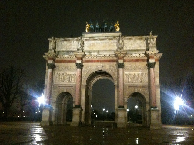 1806年から1808年にテュイルリー宮殿の門として建設されたカルーゼル凱旋門 (Arc de Triomphe du Carrousel) は、宮殿撤去後のカルーゼル広場で最も目立つ建物となった。これはナポレオンのそれまでの戦勝を記念して1806年に建設が始まった凱旋門である。これより有名なエトワール凱旋門も同じ年に設計されたが、建設には13年かかり、大きさもほぼ倍である。 この時すでに18時だか19時。