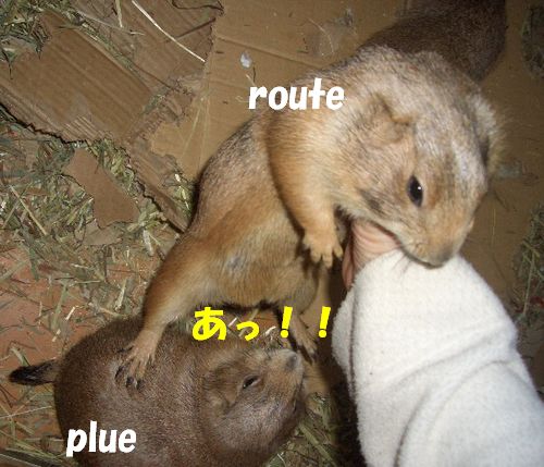 私がプレ部屋をそーっと覗くと、すかさずぷる→がタタタっと駆け寄ってくる(^-^)。今日は珍しく、る〜とも一緒にやってきた。 とたんに「抱っこ抱っこ〜」バトル勃発!(爆) 写真撮りながらだから、片手しか使えないのよ〜(^^; 突然、身軽なる〜とが飛びついた!!このままる〜と逃げ切るか!? ・・・と思われたが結局・・・甘えん坊度合いの強いほうの勝ち(^^; |