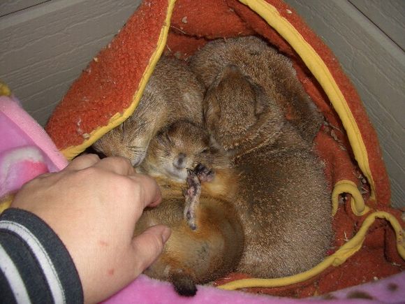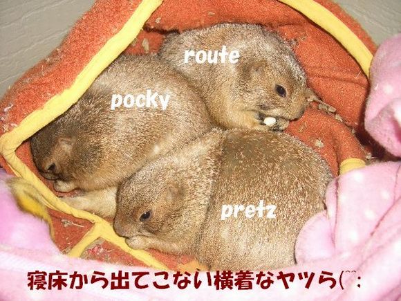 昨日、ブログ友達のyumiさんとこのリナちゃんが、昨日の朝ふと見ると、つーめたくなって意識不明になってたらしい(><) 夜とっても寒かったので、冷えすぎて仮死状態になってたみたい・・・。 幸い処置が早くて、暖めていると30分後によみがえり元気になったみたいだけど。。ほんとによかった(^-^)。 やっぱり冬眠しない動物だけど、寒さには弱いのね〜・・。 ウチもプレ部屋に特に暖房器具は使ってないので気になって覗いてみた・・。 4人仲良くおだんご状態で寝ておりました。 ってかぷる→さん、、なにやってんの?(^^; で、エサの用意をしていると、ぷる→はすぐ起きて出てきたんだけど、他の子はまったく動かず(^^; まったく、る〜とパパに似て、ぐーたら娘達だ!! |