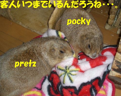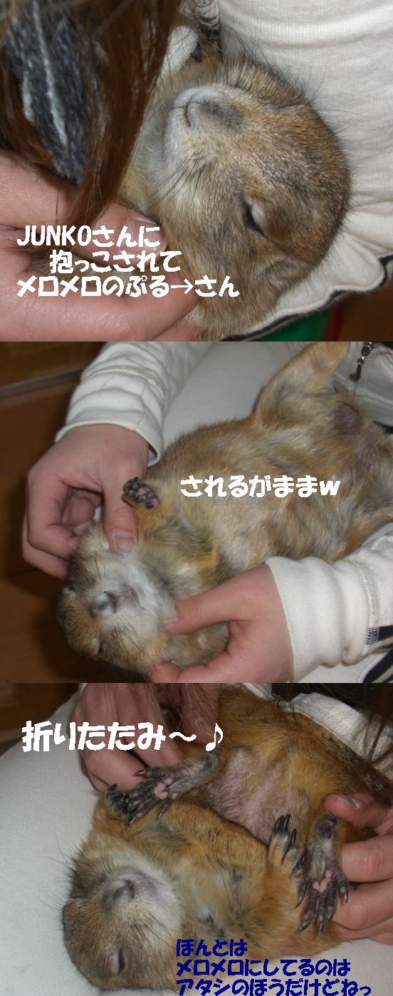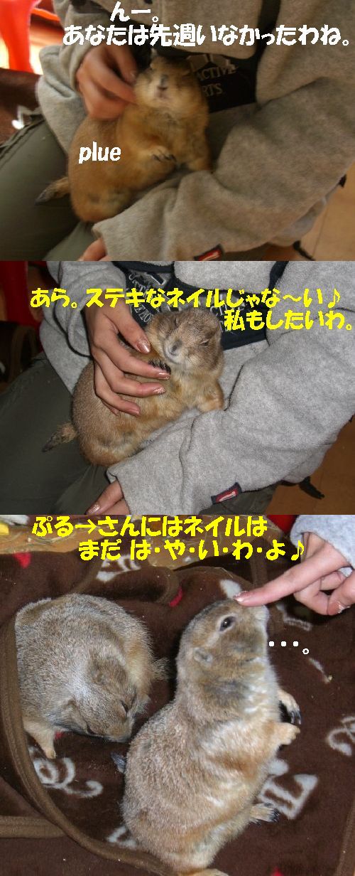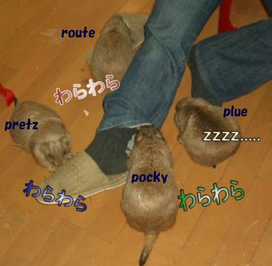 毎月恒例の(?)プレオフ会開催〜♪ すでに定例化してるよね(笑) 今日はガムシさんとJUNKOさんが来てくれました。 参加予定だったmegさんは風邪っぽいため欠席(;_;)また近いうちにね!(必ずw) 売れっ子芸能人並に忙しい日々をお過ごしのhirocoさんも「時間合えば行く!」と言ってくれてたんだけど、やっぱりダメでした(涙)いつかそのうち・・気長に待ってます(^^) で、今回は我が家へ来る前に川崎駅に隣接のラゾーナでお買い物♪ まずは、【ダイソー】(爆) ミニチュア作り&オク出品に命を燃やしてるJUNKOさんの材料入手。 結構品揃えが多く、JUNKOさんも大はしゃぎ(^-^) 私とガムシさんがまった〜り見てる間、素早い動きで店内をくまなくチェックして走り回ってたw その後、フードコートでお昼を食べたり、おしゃれ花屋さんで冷やかし客やってみたりw ラゾーナ内にあるホームセンター「ユニディ」の中にあるペットショップで買い物したり・・・ 文房具屋「丸善」で可愛い便箋、メモ類に大興奮したり、ビッグカメラ行ったり、 ジャム専門店で試食したりゆず茶試飲したり・・・・ 美味しそうなザッハトルテにメロメロになりつつあまりの高価さに手が出ず、もう少しお手軽なケーキをそれぞれ購入して満足したり(^^) ・・・結局3時間、ラゾーナの1階部分のみで、かな〜〜〜り有意義な時間を満喫しちゃいました(笑) 足は疲れたけど、楽しいね〜〜^▽^ やっとこさメインのw我が家へ。 プレとクレアが待ってるよ〜ん♪ まずはポッキー。 最近マイブームの足中ホリホリ攻撃。結局最初から最後までず〜っとガムシさんの足をお借りしてました(^o^; http://www.eryou.com/yasuyo/070212_01.jpg いつものことながら、人見知りという言葉を全く知らない、ぷる→さん(笑) 骨抜き、ぐにゃぐにゃの身体をまかせきっておりましたww http://www.eryou.com/yasuyo/070212_04.jpg そして今日の快挙! いつもは引っ込み思案でお客様にはまったく近づくことができなかったプリッツが・・・。 最初だけ巣箱に隠れたりしてたけど、ほとんどの時間みんなと同じように堂々とw真ん中で遊べるようになりました(^^) そしてなんと、ガムシさんの足に接近!! ガムシさん「感動〜〜!!」(笑) http://www.eryou.com/yasuyo/070212_02.jpg いや〜、プリッツも大人になったもんだ(;_;) ←おかしい(^^; そのうち4匹ともガムシさんの足元にわらわらと集合。が、思い思いの遊びをしてました(笑) http://www.eryou.com/yasuyo/070212_03.jpg 一応発情期中のる〜とは、いつ攻撃するか分からないのでガムシさんもちょっと警戒してた(^^; いやしかし毎度毎度濃い〜〜時間をすごせるよね、飽きもせず(爆) あ〜〜楽しかった*^o^* また遊ぼうね〜(^o^)/ |