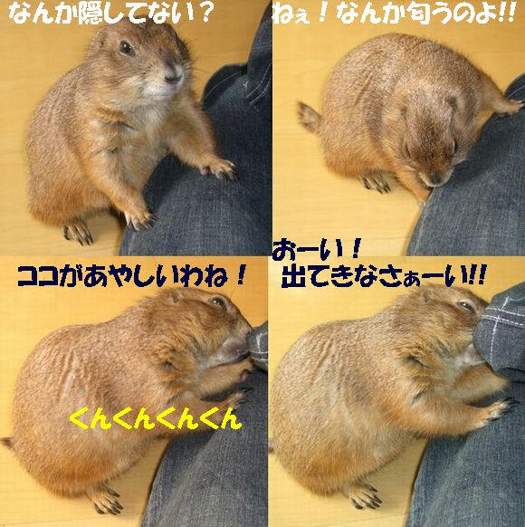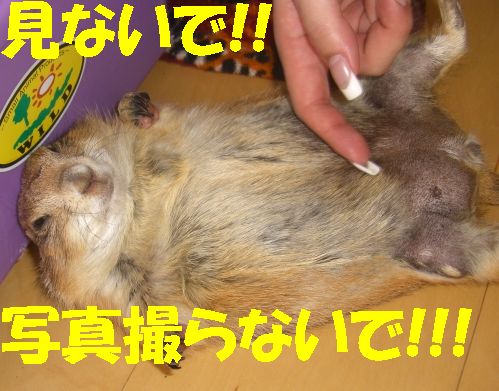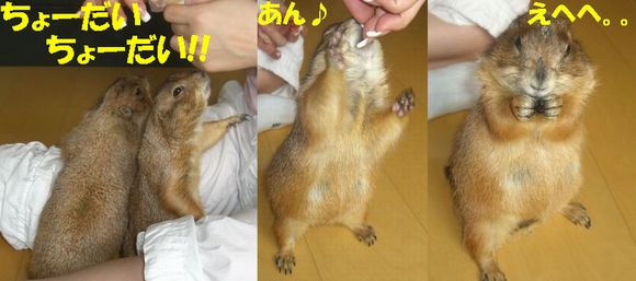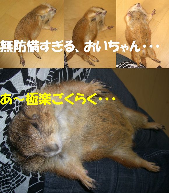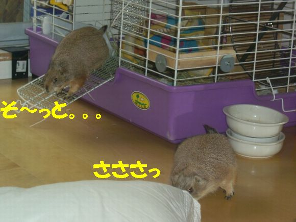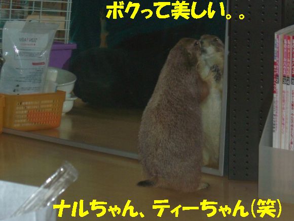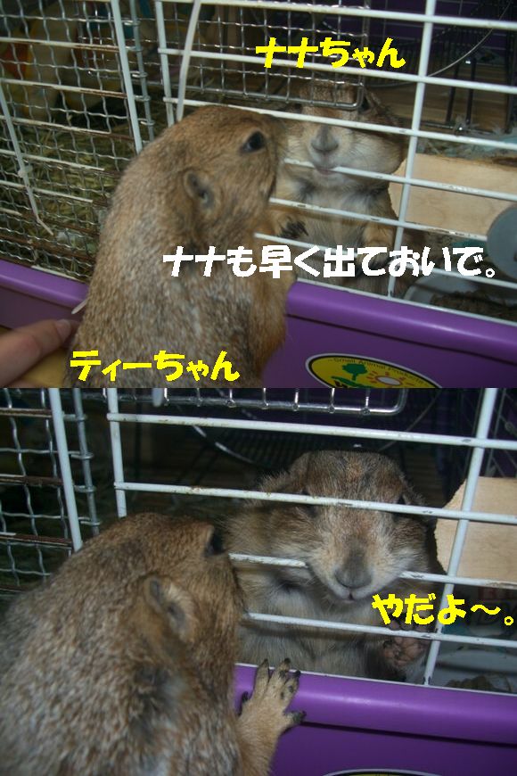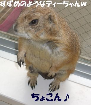 土曜日の我が家に引き続き、日曜日は赤坂にあるセレブJUNKO邸へお邪魔してきました〜♪ 午前中一人で上野動物園へ行ってきた、てるちゃんと共に*^-^* 最寄り駅が、六本木、赤坂、赤坂見付、溜池山王・・・首都ド真ん中です(^^; 溜池山王で待ち合わせ、韓国料理屋へ。ワーイワーイ(^▽^) 赤坂も韓国料理屋だらけなのね〜〜。 一人テンション上がり気味でしたw その記事はまた別途。 繁華街を抜け、坂道を少し登って、JUNKOさんのマンションに到着。 「ワンルームだから狭いよ〜〜!!」 と言ってたけど、なんのなんの。広い広い。十分ですわよ〜〜!! なにより、窓から見えるのは・・・天下の六本木ヒルズ〜〜〜(*^o^*) さてさて。メインはもちろんプレ's!おいちゃん・ナナちゃん・ティーちゃんの3人がお出迎えしてくれましたー♪ も〜写真いっぱいありすぎて大変>< 手当たり次第載っけちゃいまぁす(笑) まずは、ナナちゃん(^o^) ケージをアムッとくわえる顔が最高!! http://www.eryou.com/yasuyo/060827nana02.jpg http://www.eryou.com/yasuyo/060827nana01.jpg これもナナちゃんで合ってる? http://www.eryou.com/yasuyo/060827T05.jpg そして、3人の中でも私のハートをワシ掴みにしたのが! おいちゃ〜ん!! いつもJUNKOさんの記事で見てたけど、実際会うともうメロメロ〜〜*^o^* マジで連れて帰りたかったよw ギザカワユス〜〜〜(爆) http://www.eryou.com/yasuyo/060827oi03.jpg とにかく、必ず誰かにくっついて、ちょっとなでるとすぐにダラ〜〜〜ンと脱力(爆) いやぁ〜、こりゃかわいいわぁ〜(笑) http://www.eryou.com/yasuyo/060827oi00.jpg こちらは、なぜか急にスイッチが入る、おいちゃん vs ティーちゃん。なんのきっかけだか謎。 2時間くらい、まった〜りとプレと戯れて幸せだった〜*^o^* いつもと違うテンションで落ち着きのないプレ'sに、JUNKOさんはあっちこっち見張って怒って、ケージに戻して・・と終始忙しそうだったけど(^-^; ありがとね〜♪ JUNKOさん。 また遊びましょ〜〜! おいちゃんにまた会いた〜い♪ 最後に、全然元気マンマンのおいちゃん。回し車ガンガンです! いつもよりテンション上がってたみたい(笑) |