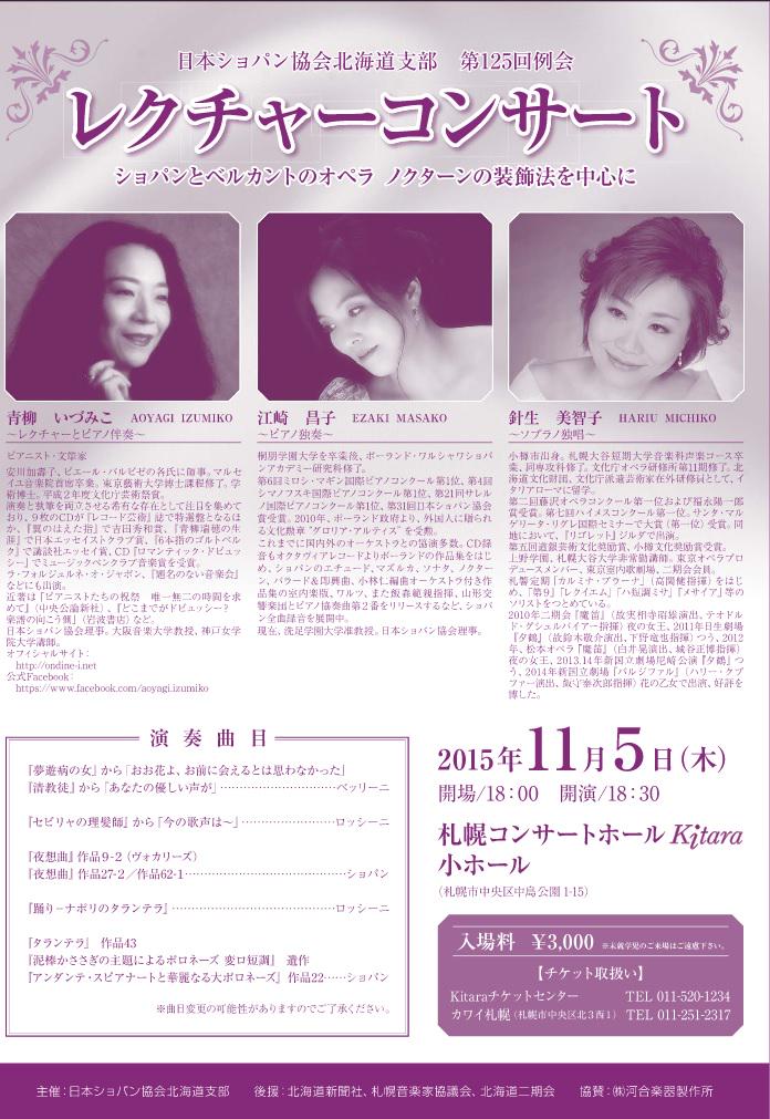 「ショパンとベルカントのオペラ」日本ショパン協会北海道支部主催のレクチャーコンサートがのお知らせです。 2015/11/5(木) 18:00(開場)18:30(開演)入場料3000円 ![]() |