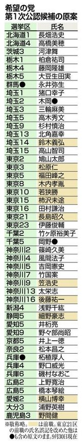 希望の党は小選挙区選の公認候補として220人以上を擁立する方向で最終調整に入り、そのうち民進合流組は約130人。