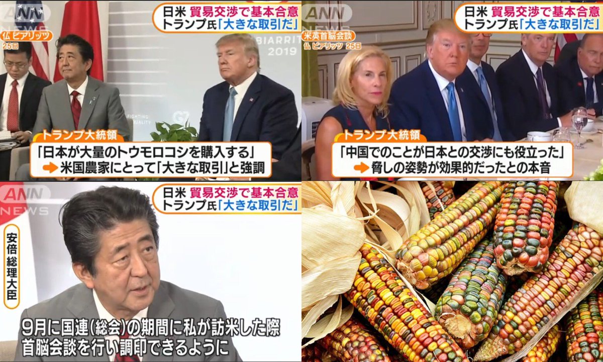 トランプ大統領「アメリカのいろんな地域でトウモロコシが余っている。安屁総理が購入してくれるのはとても大きな取り引きだ」https://www.sankei.com/economy/news/190826/ecn1908260002-n1.html