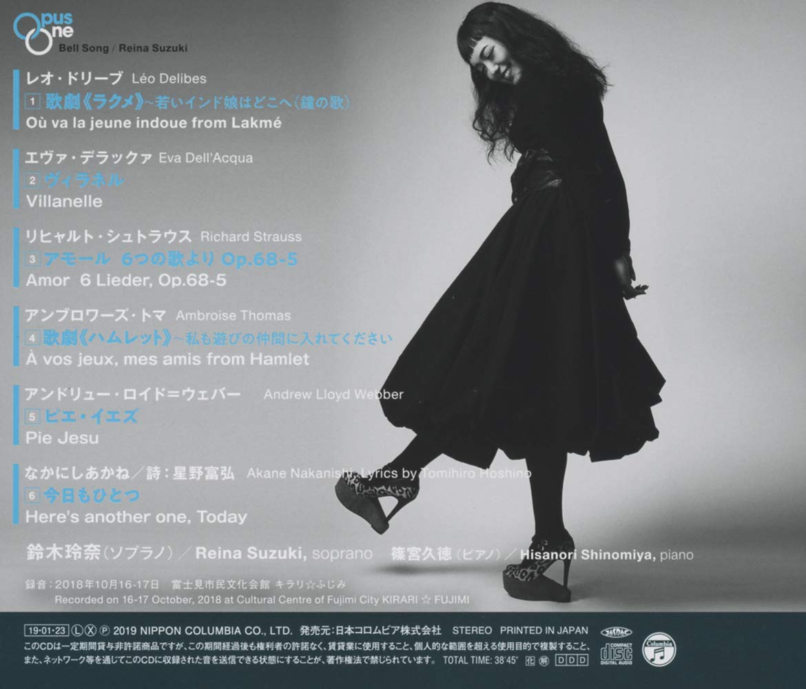2018年10月16-17日 富士見市民文化会館 キラリ☆ふじみ 数多くの有望な新人音楽家を世に送り続けている日本音楽コンクール声楽部門優勝をはじめ、数々の受賞歴を持ち、すでにオペラやコンサートなどで活躍の場を広げている鈴木玲奈。聴くものの心をたちまち魅了し、限りない幸福感と安らぎを感じさせてくれる歌唱と共に、華やかな容姿と完璧なコロラトゥーラの技術で表現された魅惑的な響きは、まさに彼女の名前が表す鈴の音色。どの曲も例え言葉は解らずとも、瞼の裏にその舞台が、場面が浮かんでくるような素晴らしい表現力で聴かせ、天賦の音楽性での日本声楽界でのコロラトゥーラの女王となるべく逸材でもある。 音という宝石が触れ合って共鳴する曇りのない鈴木玲奈の美しい歌声に、いつまでも触れていたいアルバム。 東京音楽大学声楽演奏家コース及び同大学院を共に首席で修了。