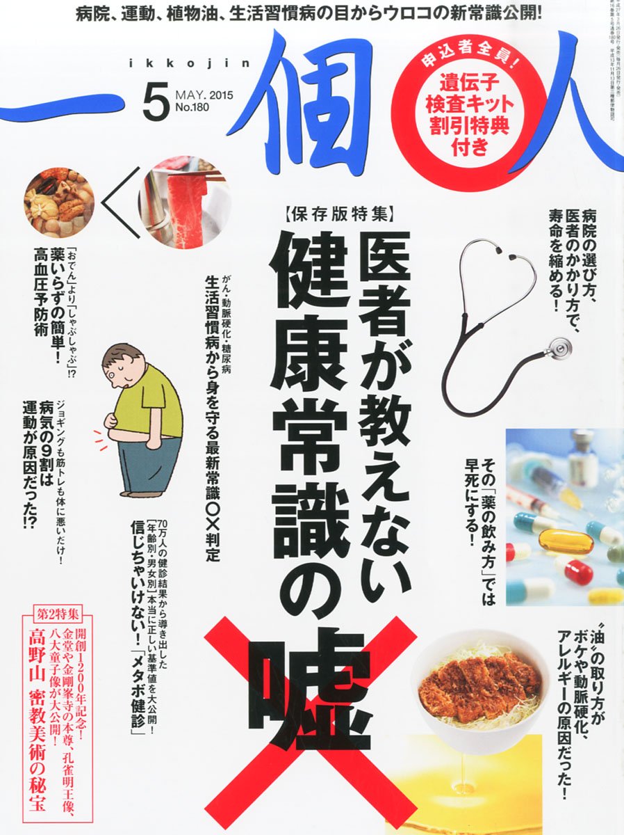 ○病院、医者選びの嘘 【病院のかかり方、医者の選び方で寿命が縮まる!】 ○薬の飲み方の嘘 【その「薬の飲み方」では早死にする!】 ○食生活の嘘 【こんな食生活をしていると病気になる!?】 【「血糖値を上げない食事の新常識 食べるならどっち!?】 ○生活習慣病の嘘 ○運動の嘘 ○高野山密教美術の秘宝 http://www.amazon.co.jp/dp/B00T3C6LKY あれこれ健康情報が飛び交っていて商業主義的なものがおおいと思います。 売れればいいなんて考えの人の健康の情報を取り入れるのは恐ろしいです。 しかしそのような情報が多くテレビの番組でも煽ったりしていますよね。 この本の内容はそういった意味ではそこそこ信用できると思いました。 きちんとしたエピデンスを取っているわけではないので印象だけですが。 |