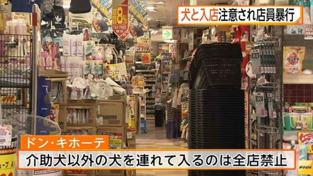 傷害の疑いで逮捕された、自称・無職の藤田正敏容疑者(59)は、午前0時すぎ、 市川市行徳駅前の大手ディスカウントストア「ドン・キホーテ行徳駅前店」に、 犬と一緒に入ろうとしたところ、レジにいた女性店員(24)に注意されたことに腹を立て、 店員を殴った疑いが持たれている。 女性は、顔を殴られ、打撲の軽傷を負った。 調べに対し、藤田容疑者は「納得がいかず、頭にきて殴った」と、容疑を認めている。 ドン・キホーテによると、店内に介助犬以外の犬を連れて入るのは、全店で禁止しているという。 http://livedoor.blogimg.jp/ko_jo/imgs/b/8/b8732a97-s.jpg http://www.fnn-news.com/news/headlines/articles/CONN00347428.html |