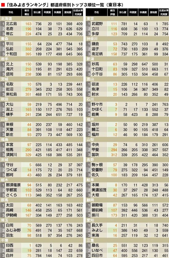 最後に、各県別のトップ3は以下の結果になっている。総合1位の印西市が属する千葉県は都市による順位の差が激しい。ここでも富山、石川、福井の北陸3県と愛知県の強さが際立っている。
