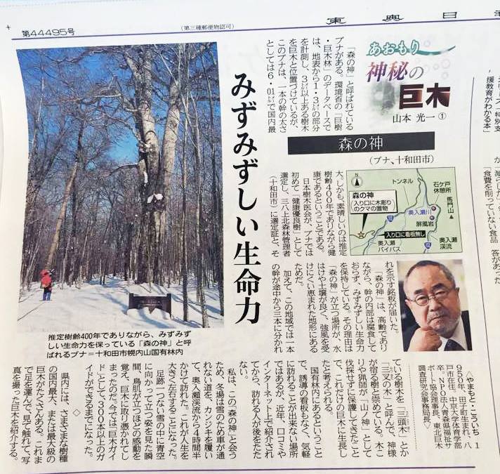 5月19日から執筆担当 、山本光一東北巨木調査研究会事務局長で青森県の地元紙東奥日報夕刊(毎週火曜日)に県内の巨木をシリーズで紹介する「あおもり神秘の巨木」がスタートしました。