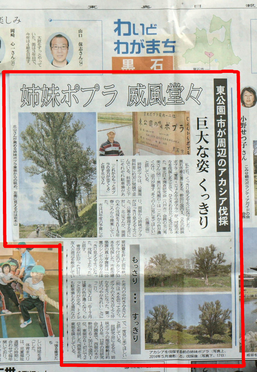 5月19日から東北巨木調査研究会の山本光一事務局長が執筆を担当し青森県の地元紙,東奥日報夕刊(毎週火曜日)に県内の巨木をシリーズで紹介する「あおもり神秘の巨木」がスタートしました。 今回はシリーズ7回目(7月7日掲載)黒石市の東公園に並び立つ全国1位と2位の「東公園の姉妹ポプラ」愛称(じょんからポプラ)を紹介しておりますす。 上の新聞記事の中にある写真は2012年12月に初めて姉妹ポプラを