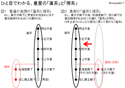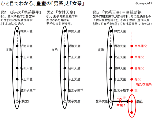 「直系と傍系、男系と女系」 ひとめでわかる皇位継承の基礎知識 女性宮家創設・そこへの旧皇族の養子入りは皇室の伝統に反し、 天皇陛下のお考えでもありません。 羽毛田宮内庁長官および、その背景にいる勢力の「自作自演」劇です。 旧宮家の復帰だけが正統かつ、この国を安定永続させる道です。 −−−−−−−−−−−−−−−−−−−− できましたら、【拡散・転載】お願いいたします。 −−−−−−−−−−−−−−−−−−−− この記事では、中川八洋 皇位継承学概論 「『皇統断絶』、ビジネス社・『女性天皇は皇室廃絶』、徳間書店・『悠仁天皇と皇室典範』、清流出版・『小林よしのり「新天皇論」の禍毒』、オークラ出版」より、そのエッセンスを極力平易にお伝えしたい。 ● 真実の「直系と傍系」 直系というのは、自分の子供達が大事だからそこに皇位を継がせる、などという「皇位の私物化」ではなく、神武天皇と自分と未来の天皇たちが男系だけで「直結」という意味。 「天皇の位は(皇祖皇宗から)預かったもので、われわれの私有ではないことを大切に考えて欲しい。」 (貞明皇后が皇太子殿下(後の昭和天皇)に宛てて) http://livedoor.blogimg.jp/shinseihoshu/imgs/c/b/cbe2e4f4-s.gif こういう観点で表現された、皇室の系図が正統であり、具体的には次のように表現される。 (ソースはこちら) ・男性天皇は青地、女性天皇は赤地。 ・ 天皇(夫)と后(妻)は青太線で(別の妻経由で)繋がっている。 ・ 夫妻間を結ぶ青太線の下に子が黒い線でぶら下がっている。 ・下向き矢印は同一人物。 ・天皇の上下の順は皇位継承順に対応。 ・今上天皇から神武天皇までの繋がりを赤線で表している。 http://livedoor.blogimg.jp/shinseihoshu/imgs/a/8/a85c9761-s.png http://livedoor.blogimg.jp/shinseihoshu/imgs/f/7/f73e0c80-s.png http://livedoor.blogimg.jp/shinseihoshu/imgs/8/c/8c2be457-s.png http://livedoor.blogimg.jp/shinseihoshu/imgs/7/c/7c2cdd09-s.png この真中の赤いライン、これが「今の天皇陛下にとっての」直系である。 図の右側に、黒線でつながって歴代の天皇陛下がおられる。 各天皇が御在位の時は、その天皇陛下に向かって直系が決まっており、 直宮に皇胤がないなどの原因で直宮に皇位が継承されない時は、 傍系に皇位が移り、そこが「新たな直系」となる。 これが繰り返されて、「今の天皇陛下にとっての」直系になったのだ。 もう一度最初の図を示しておこう。 http://livedoor.blogimg.jp/shinseihoshu/imgs/c/b/cbe2e4f4-s.gif 皇胤が授からなかければ、そこで終わる「枝(傍系・支系)」となる。 「枝」が行き詰まりになれば、 「幹」に戻って別の「枝」に皇位が移り、 そこが新たな「幹」となる。 大きな「枝」が絶えた時は、より根元に戻って別の「枝」に移る。 でも、どの「枝」も、どの「幹」も、根っこは、神武天皇である。 どんな天皇陛下も、必ず、男系で神武天皇に戻る事ができる。 これは神武天皇以来125代の「全ての天皇陛下」が満たされている条件だ。 この新しい「幹」の受け皿こそが、「宮家」なのである。 「宮家」は傍系にあるが、しかし、いつ「直系」になってもおかしくない、 天皇予備軍(皇位継承予定者)なのである。 直系というのは、 自分の子供達が大事だからそこに皇位を継がせるなどという、 「皇位の私物化」ではなく、 神武天皇と、自分と、未来の天皇たちが、 男系だけで「直結」という意味なのだ。 ●真実の「男系と女系」 さて、もし、愛子内親王が天皇に即位されたとする。 愛子「天皇」は天皇であるがその父は皇太子殿下であるから、 「男系・女性天皇」ということになる。 愛子「天皇」から男系できちんと神武天皇につながっている。 しかし、この子供はどうだろうか・・・。 皇室の伝統には、女性天皇が子供を生まれた歴史はない。 それどころか、 結婚されないか、 皇族と結婚されて未亡人になっておられるか、 どちからかしかない。 もし、ご結婚され子供を生まれ、そこに皇位が継承されたとしたら・・・。 当然、「新たな直系」が決まることになる。 そして、その「直系」を遡っていくと・・・。 残念ながら、歴代の天皇陛下と違って、この方だけは、 「神武天皇」にはたどり着けない。 すなわち、ここについに、 「歴代の天皇陛下と全く違う」天皇が生まれる事になる。 これこそが、「皇統断絶」に他ならない。 http://livedoor.blogimg.jp/shinseihoshu/imgs/5/f/5faa5c35-s.gif 天皇という位は、125代代々継承されてきた。 歴代天皇陛下が、「思い」に基づいて皇位を左右されていた訳ではない。 10代、20代、30代、・・・、100代、110代、120代 とその継承が行われた結果、 皇位は、「歴代と同じように継承」することが、正統性の根拠となっている。 無論、三種の神器、天壌無窮の神勅、大嘗祭・・・。 これらは皇位継承に欠かせない。 正統性を裏付けるものになっている。 しかし、それをさらに正統化しているのは、その継承の儀式、継承の御印が、 125回も繰り返されされ、代々受け継がれているということなのだ。 「歴代と同じよ