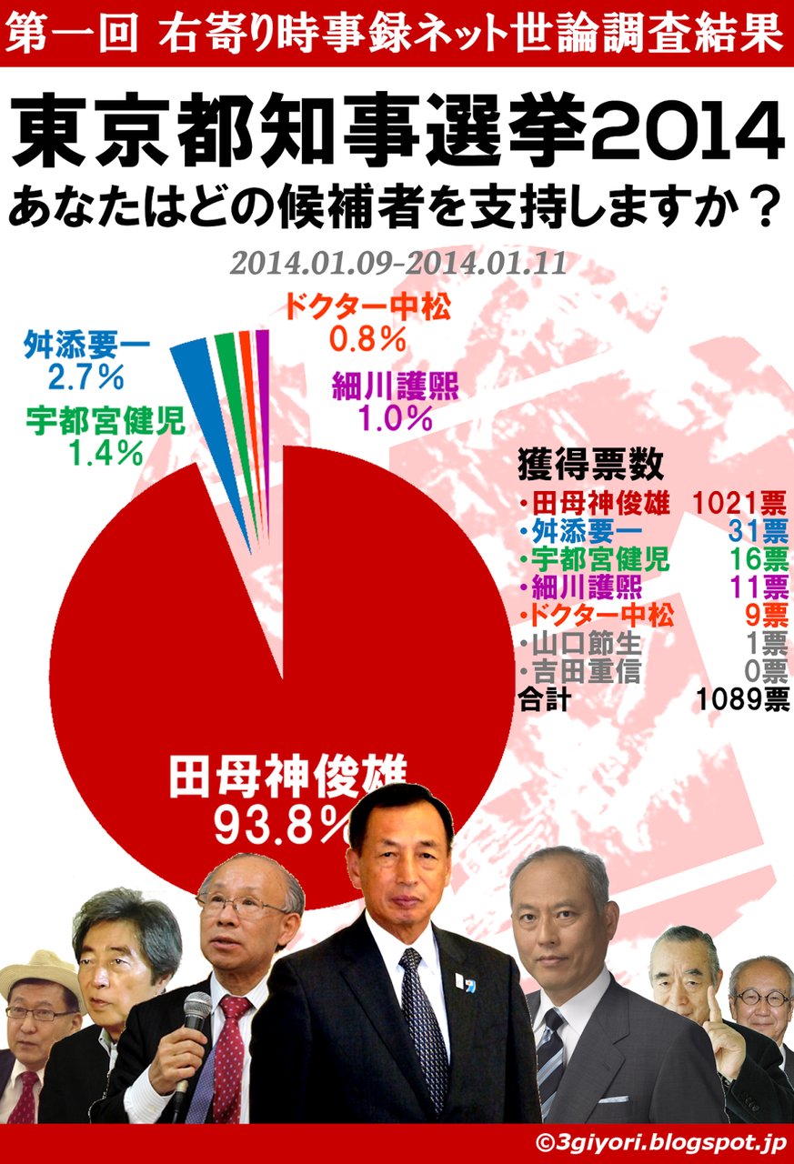 また調査結果が偽装捏造されているので大幅に異なる結果が出てきます。 支那朝鮮に支配されたテレビ局・マスコミの騙される方が悪いとする姿勢を見抜き日本を救う都知事を誰にするのか厳しい判断を下して下さい。 実際にこのようになってくれますように。