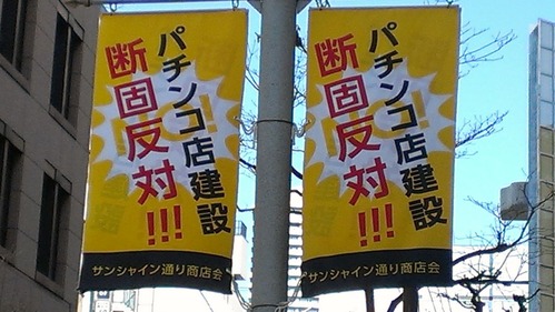 http://livedoor.blogimg.jp/the_radical_right/imgs/2/c/2cb38cc5.gif ←ブログランキング応援クリックお願いします。 ↓以下が我々『パチンコ廃止を求める会』のスローガンを書いた宣伝旗です。 http://livedoor.blogimg.jp/the_radical_right/imgs/b/1/b1db43e5.jpg 今回、「このような旗を見つけましたが、そちらでおやりになっている運動ですか?」とのメールを頂きました。 http://livedoor.blogimg.jp/the_radical_right/imgs/0/a/0a7ebb42-s.jpg 確かに色合いやデザインが似ていますね。しかし、こちらの旗は我々パチンコ廃止を求める会が作成したものではありません。我々の存在を知って同じような図柄での反対運動であれば嬉しいです。 ネットで検索したら幾つか出ていました。一つだけ紹介します。 池袋のパチンコ出店反対運動 60通りの1本北側のサンシャイン通り。 ヤマダ電機総本店の向かい側で新築ビルの工事をしています。