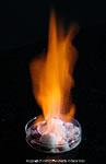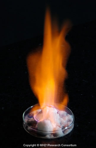 (左)「燃える氷」人工メタンハイドレートを燃焼させたもの