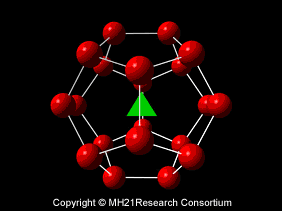 メタンハイドレートの結晶構造 三角緑はメタン分子、球赤は水分子