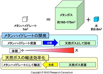 逆に、メタンハイドレートは、自身の体積の中に約160-170倍のメタンを取り込むことができるということになります。この性質を利用し、メタンを主成分とする天然ガスをハイドレート化させ、体積を小さくして効率よく天然ガスを輸送しようという試みも、天然メタンハイドレート開発とは別に研究されています。(参照:石油天然ガス・金属鉱物資源機構HP)