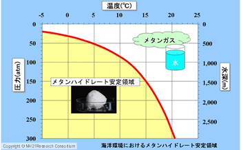 自然界の天然メタンハイドレートメタンハイドレートは「低温高圧」で存在することができます、すなわち、「温度が低い、かつ、圧力が高いところ」となります。定量的には以下のとおりです。