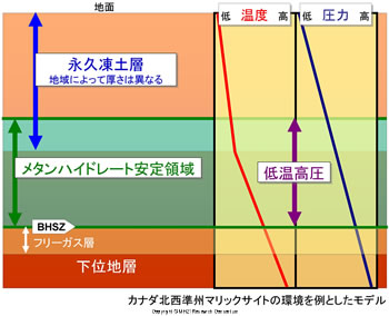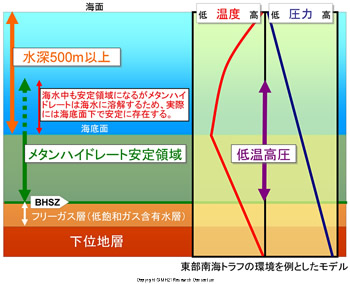 しかし、圧力が高くなれば、温度が多少高くてもメタンハイドレートは存在できるので、地層の重みがかかる地層中にメタンハイドレートが存在することができる可能性があります。