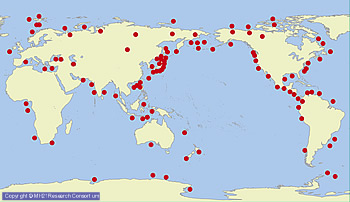 下図はこれまで世界でメタンハイドレートが発見・分布予測されている場所を示しています。