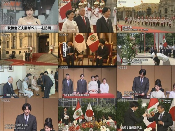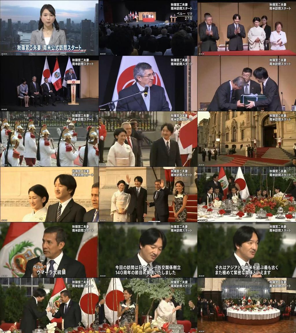 秋篠宮文仁親王と文仁親王妃紀子両殿下は、1月25日から12日間の日程で日本との外交関係樹立140周年を迎えたペルーと、移住協定の発効から50周年を迎えたアルゼンチンを、国際親善のため公式訪問されています。 昨年6月のクロアチア共和国、スロバキア共和国、スロベニア共和国の3カ国の公式訪問時のご様子を記事にしましたが、今回も2カ国に分けて、いろんなとこから調べて写真にてご様子をお伝えします。 秋篠宮同妃両殿下 中東欧3カ国よりご帰国 秋篠宮同妃両殿下 中東欧3カ国 / スロバキア編 スロベニア / 秋篠宮同妃両殿下 中東欧3カ国 まずは、ペルー編です。 2014年1月27日 日本人ペルー移住100周年記念碑に献花され拝礼される秋篠宮両殿下 ペルー日系人協会で松を植樹される秋篠宮 http://livedoor.blogimg.jp/j1bkk/imgs/9/1/915bf546-s.jpg http://livedoor.blogimg.jp/j1bkk/imgs/6/0/60cad7f5-s.jpg 27日、訪問先のペルーの首都リマで、日本とペルーとの外交関係樹立140周年記念式典に参加された。秋篠宮さまは式典で「日系人がペルー社会の重要な一翼を担っていることを大変喜ばしく思う」とあいさつされた。 日本からの移民一世四人とご歓談 El Presidente de la Republica, Ollanta Humala Tasso, recibio esta tarde en Palacio de Gobierno a sus altezas imperiales del Japon, el Principe Fumihito Akishino, y su esposa, la Princesa Kiko Akishino, quienes se encuentran en nuestro pais en Visita Oficial. ペルー大統領府のサイトより http://www.flickr.com/photos/65990097@N03/sets/72157640235256134/ 動画 http://www.andina.com.pe/Espanol/video-principe-japon-fumihito-akishino-y-su-esposa-kiko-palacio-gobierno-29904.aspx 大統領府を訪れて歓迎式典に臨み、秋篠宮さまはウマーラ大統領を、紀子さまは大統領夫人を、それぞれ表敬訪問されました。続いて、大統領夫妻が主催する夕食会が開かれ、秋篠宮さまが「日本とペルーの関係は、アジアと中南米を結ぶ最も古く、また極めて緊密な関係と言えます。両国と両国民の末永い友好を願います」とスピーチされました。秋篠宮ご夫妻 ペルーで式典出席 - NHK(28日 16:11) http://livedoor.blogimg.jp/j1bkk/imgs/a/1/a166fc32.jpg 1月28日 エンマヌエルホームをご訪問 http://www.perushimpo.com/noticias.php?idp=5100 天野博物館 28日、国立ラ・モリーナ農業大学(National Agrarian University - La Molina) にて TV Peru の動画 http://www.tvperu.gob.pe/noticias/locales/otros/54793-principes-de-japon-visitaron-campos-de-quinua-.html http://noticiasnippon.jp/akishinomiya-conocen-el-peru-antiguo/ 2000年ほど前に作られ、16世紀にスペイン人の侵略で焼き払われるまで 先住民の聖地として崇拝されたパチャカマック遺跡。 http://noticiasnippon.jp/akishinomiya-admirado-por-la-fauna-peruana/ その後、ペルーの多様な生き物が生息するレイェン ダス公園でカピバラなどをご覧になった。 次回はアルゼンチン編です。