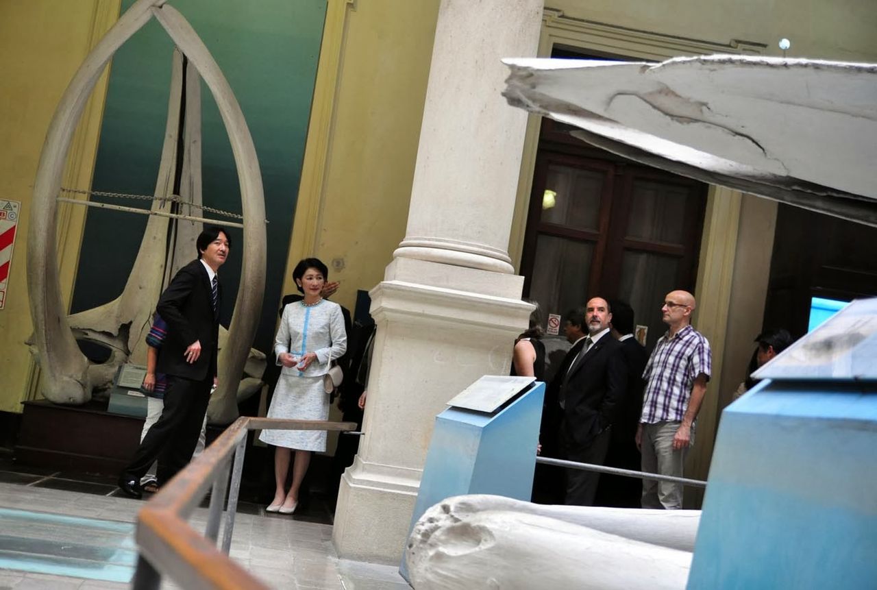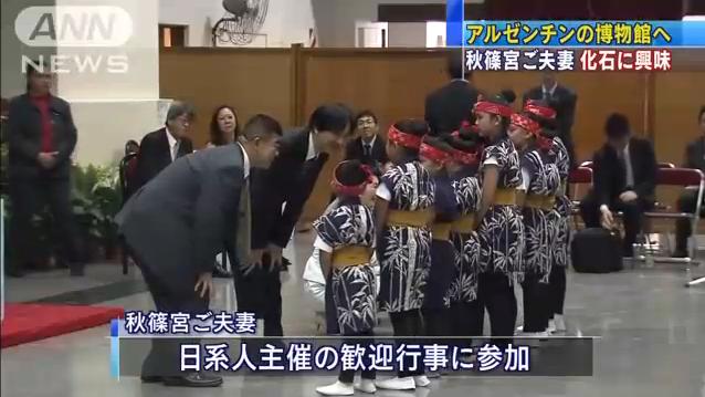 動画 http://www3.nhk.or.jp/news/html/20140201/k10014946201000.html 動画 http://news.tv-asahi.co.jp/news_international/articles/000020730.html 日本とアルゼンチンとの移住協定発効50周年を祝う式典などに出席するため、南米アルゼンチンを訪問している秋篠宮ご夫妻が、現地在住の日系人主催の歓迎行事に参加されました。 アルゼンチン在住の日系人は3万人を超え、このうち7割以上が沖縄出身です。秋篠宮ご夫妻はブエノスアイレスで開かれた日系人らによる歓迎行事に参加し、沖縄の民族衣装を着た子どもたちと言葉を交わしたり、日本舞踊などをご覧になりました。その後、ご夫妻は、ブエノスアイレスから車で1時間ほど離れた国立ラプラタ大学自然科学博物館を訪れ、浴衣姿の子どもたちが出迎えました。ご夫妻は展示されている巨大な恐竜やクジラの化石などの説明を熱心に聞き、秋篠宮さまは持参のカメラで写真を撮影されていました。 現地在住の日系人主催の歓迎行事 国立ラプラタ大学自然科学博物館 動画: 日本とアルゼンチンとの移住協定発効50周年を祝う式典などに出席するため、南米アルゼンチンを訪問している秋篠宮ご夫妻がアルゼンチン伝統の銀細工の工房などを視察されました。 http://livedoor.blogimg.jp/j1bkk/imgs/c/6/c609843e-s.jpg