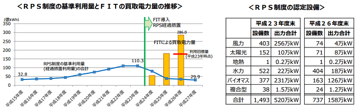 図2 RPS制度の基準利用量とFITの買取電力量の推移 出典:資源エネルギー庁 |