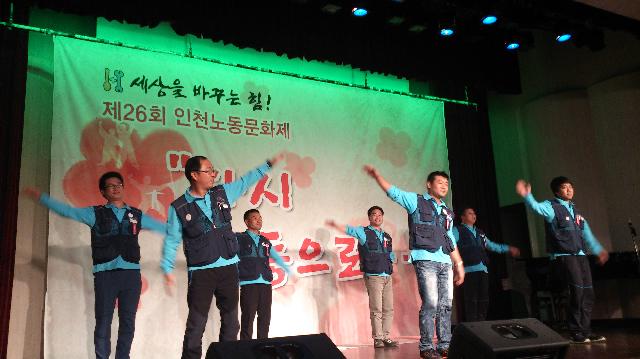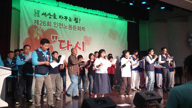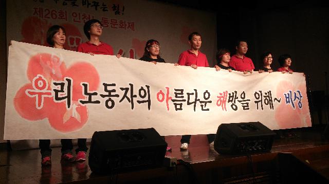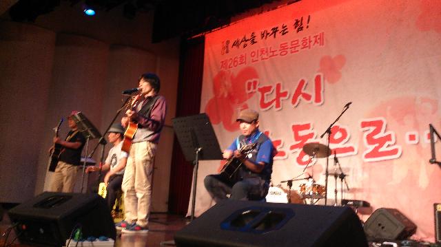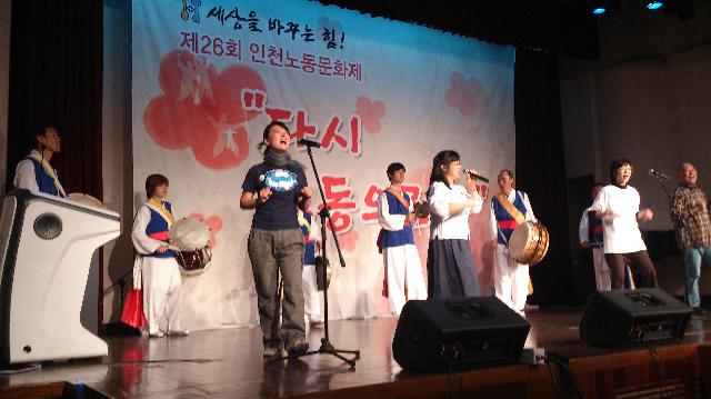 12日午後6時からプピョン区庁の大講堂で行われた「第26回インチョン労働文化祭には、「コルベン」という名前のバンドでコルト・コルテックの労働者が出演して歌いました。コメントで「7年間の闘いは苦しく、大変なことが多かったです。闘うことができるのは見守ってくれる家族がいるからです。家族のことを考えると・・・」と声をつまらせました。そして「でも、あきらめずに最後まで、勝利するまで闘います」と支援を訴えました。