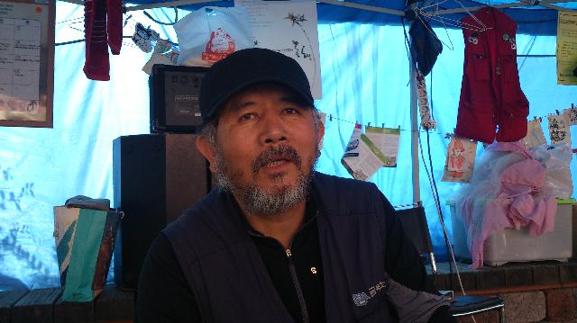 12日午前、コルト・コルテック労組のテント籠城現場(写真上)を訪問しました。日本に遠征闘争で来たことがあるコルト楽器支会長のパンジョンウンさん(写真下)が迎えてくれました。アコースティックギターをつくっているコルト社と電気ギターのコルテック社のパクヨンホ社長は、労組を嫌い、何度もの整理解雇の末、韓国内にある工場をすべて閉鎖し、中国やインドネシアに移転しました。労働者たちは裁判闘争や工場での籠城を繰り返しながら闘いましたが、公権力の導入で暴力的に工場から追い出され、現在はインチョンのプピョン工場の向かい側にテントを張って座り込み、闘っています。