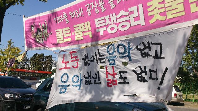 韓国の最高裁判所はコルト楽器の労働者に対する整理解雇は不当だという判決を出しています。しかしコルト資本は、無視して再解雇の通知を出しました。そのような資本に対し、「私は、労働と音楽を尊重しないパクヨンホ資本のコルト・コルテックギターを買わないし、演奏もしません」という不買署名運動を行っています。10万人を目標にしていますが、すでに1万人の署名が集まり、新聞に広告を出しています。またプピョンとソウルで「流浪文化祭」を行い、闘いへの支援を訴えています。
