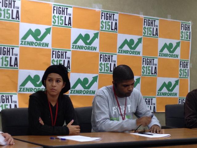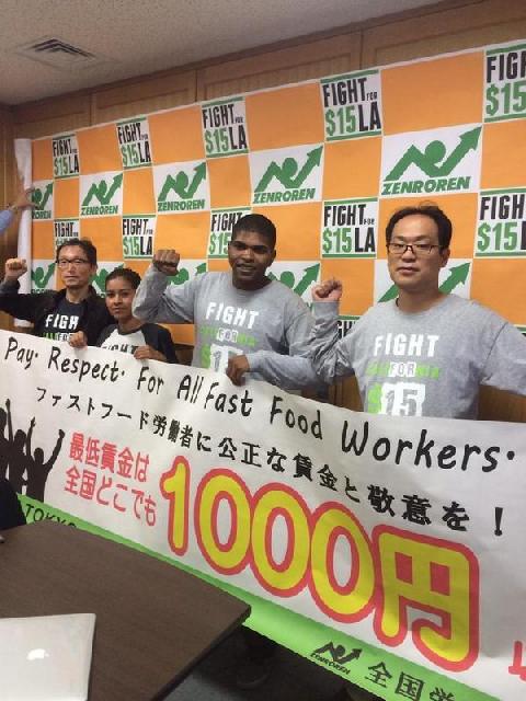 来日した労働者のひとり、アルビナ・アードンさん(左)は夫と二人でロスのマクドナルドで働いているが、それでも生活苦に直面している現場を打開しようと、今年5月に全米で広がった賃金引き上げ運動に参加しストもした。若干の賃金アップを勝ち取ったものの、それでも時給9ドル5セントでは子ども二人を養っていけないと語った。アードンさん一家は、政府からの医療扶助と食料品購入に使うフードスタンプを受給している。