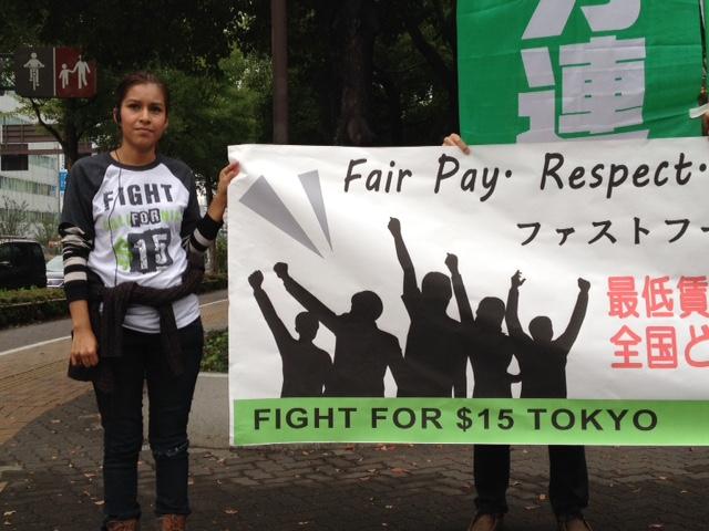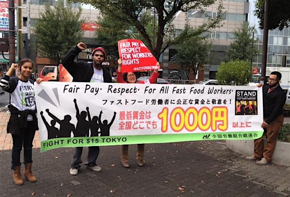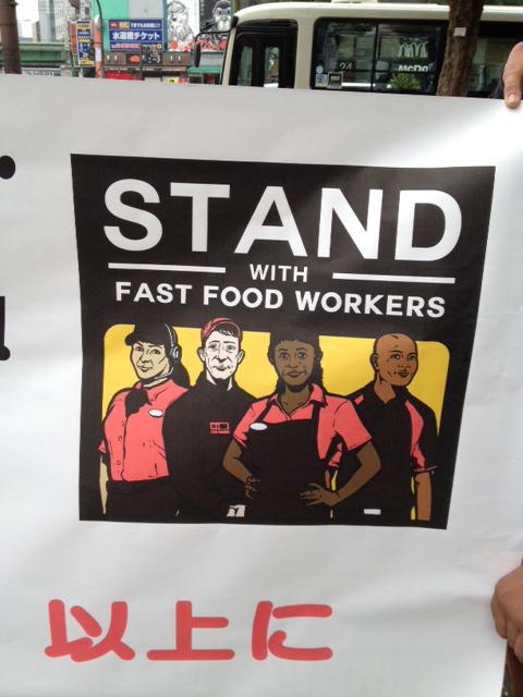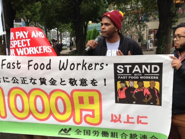 最低賃金引き上げを実現しよう!〜米国ファストフード労働者が来日松元ちえhttp://www.labornetjp.org/image/2014/mac02 *写真=都内マクドナルド前での宣伝行動(11/12) ワーキングプアの象徴とされるファストフード労働者が、最低賃金引き上げと労働組合結成の権利を求めるため、今月、世界オルグツアーをはじめた。日本を含む8カ国では、ニューヨークやシカゴ、ロスアンゼルスのマクドナルドで働く現場や、労働者が自らたちあがる重要性を訴える予定。11月11日に厚労省で記者会見があった。