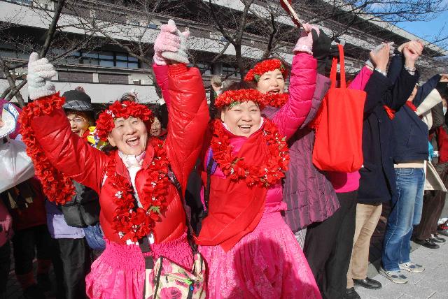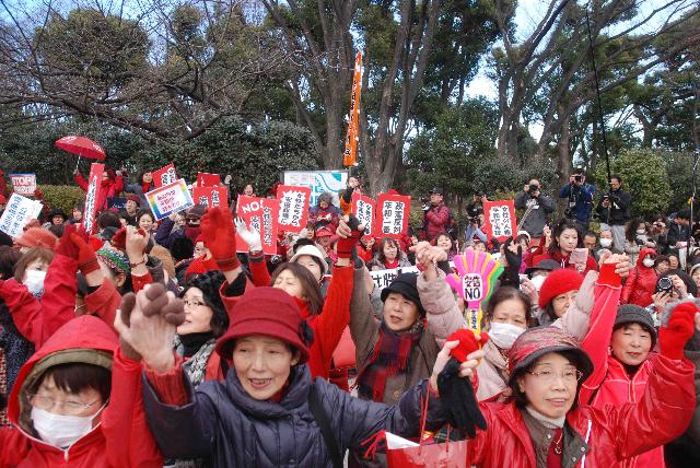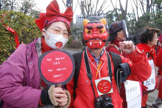 http://www.labornetjp.org/image/2015/011709 1月17日、午後1時を少し過ぎていた。地下鉄の駅には、すでに赤を身につけて人々であふれている。正門前のアピールコーナーに急ぐあいだも、たくさんの知人に会う。挨拶を交わしながら、そのほとんどの人が、原発事故の後に国会周辺で知り合った人なのに、我ながら驚く。しかも、知らない方たちも、仲間の一人が、この日のために編んでくれたと赤い帽子やマフラーを身につけたり、赤いコートを羽織ったりの人たちに、互いに「あっ、その赤いいね」と旧知のように声を掛け合ってしまった。手のこんだアップリケの横断幕を持つ女性は、30年前の中曽根の時代に作ったと誇らしげだ。