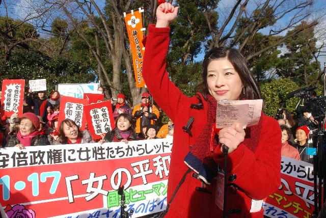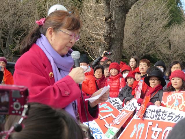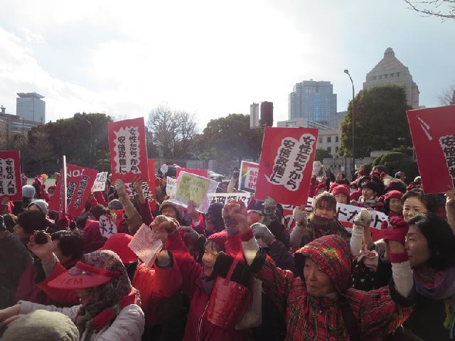 澤地久枝さんは、戦時の女たちの歴史を繰り返さないためにここに集まったと、議事堂に向かってアピールした。