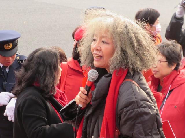 落合恵子さんは、赤い手袋の右を落としてしまった。左だけですと、ユーモアで和ませ、安倍政権を否定しましょう。だれも犠牲にならない、だれも犠牲にしない社会をと結んだ。以前はアメリカが基地反対運動のターゲットだったが、今や日本の政府になったと話すのは沖縄からの宮城晴美さん。