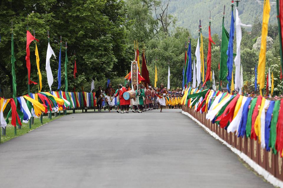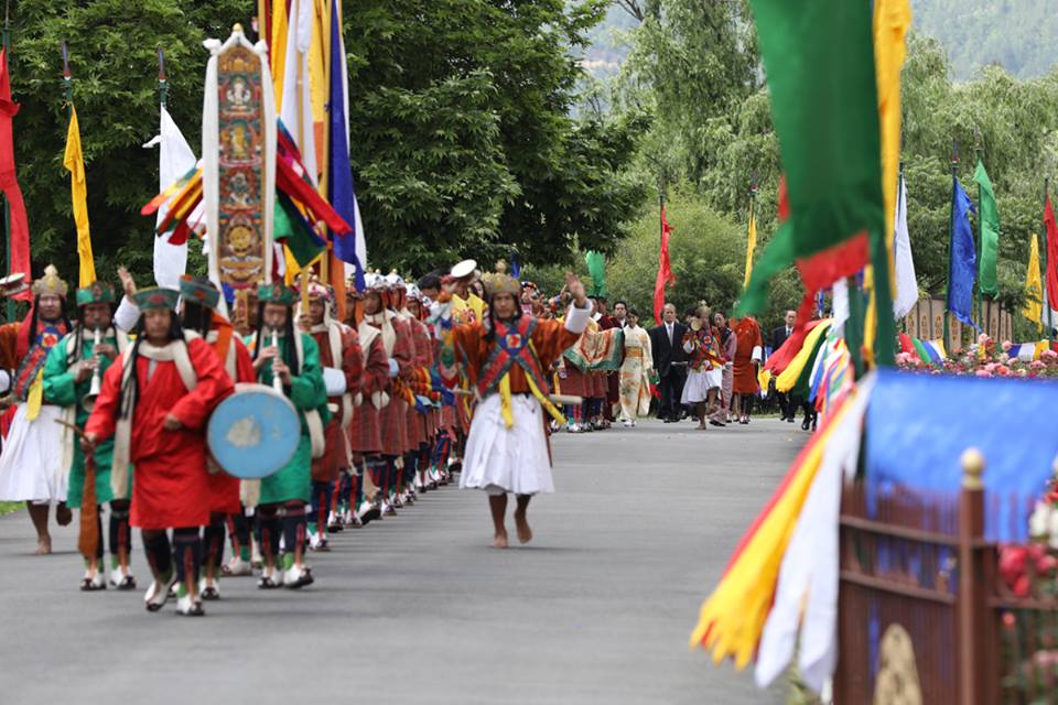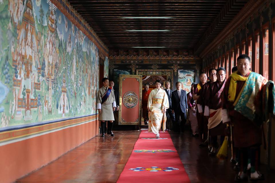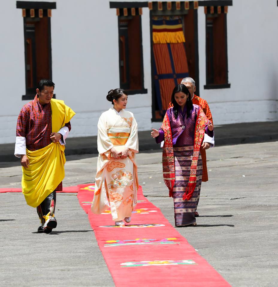 During Their Majesties' State Visit to Japan in 2011, His Majesty Addressed the National Diet of Japan, and said: ¡ÈThe world always identified Japan as a people of great honour, pride and discipline – a people with a proud tradition in history – who approach everything with tenacity, determination ...and a desire to excel – a people of unity in thought and action; of brotherhood and fraternity and unfailing strength and fortitude¡Ä ...Japan¡Çs role in the growth and development of Bhutan is very special. You have not only provided valuable aid and assistance but also been the source of strength and encouragement as we strive to fulfill our unique aspirations. Your generosity of spirit and the higher, greater natural bond between our two peoples that is undefinable and yet so deep and spiritual – ensures that Japan will always have a friend in Bhutan. HIH Princess Mako is escorted to the Golden Throne Room of the Tashichhodzong for an Audience with Their Majesties. The murals on the left side of corridor leading to the Throne Room is adorned with murals depicting the life of Buddha Sakyamuni. Her Imperial Highness Princess Mako of Akishino is on a 7-day visit to Bhutan. Her parents, Their Imperial Highnesses The Prince and Princess Akishino visited Bhutan in 1997, and the Crown Prince of Japan, His Imperial Highness Prince Naruhito visited Bhutan in 1987, a year after diplomatic ties were established between the two countries. A traditional Chipdrel Ceremony escorts HIH Princess Mako of Akishino, to the Tashichhodzong, where she received an Audience with Their Majesties. The colourful flags and pennants are part of the traditional decorations to welcome guests, as is the Chipdrel ceremony, which symbolizes the purification of the path along which the guest is led in the procession. His Majesty The King, Her Majesty The Gyaltsuen, and His Royal Highness The Gyalsey with HIH Princess Mako of Akishino, at the Lingkana Palace. Their Majesties granted an Audience to Princess Mako at the Tashichhodzong, and hosted a Luncheon at the Lingkana Palace, today. Princess Mako is the the granddaughter of His Imperial Majesty Emperor Akihito of Japan. His Majesty The King and Her Majesty The Gyaltsuen visited Japan in November 2011, soon after the Royal Wedding. Their Majesties were welcomed warmly in Japan, and the Royal Visit deepened the exceptional relations between Bhutan and Japan. Bhutan and Japan have shared a special relationship, which have been strengthened by the exchange of visits between members of the Royal Families of Bhutan and Japan. His Majesty King Jigme Singye Wangchuck visited Japan in 1989 to offer respects at the Imperial Funeral of Emperor Showa, and once again in 1990 for the Enthronement Ceremony of His Imperial Majesty Emperor Akihito. https://www.facebook.com/QueenJetsun/ https://www.facebook.com/QueenJetsun/posts/1336250486422976 His Majesty The King and Her Majesty The Gyaltsuen granted an Audience to HIH Princess Mako of Japan, at the Tashichhodzong.