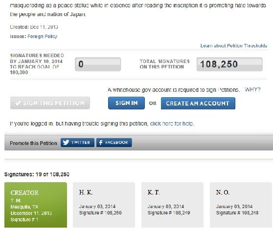 Signature # 11,421 ¤Ç¤·¤¿¤Î¤Ç¡¢¤³¤Î¸å¤Ë£¹Ëü̾¤¬½ð̾¤·¤Æ¤¯¤ì¤¿¤³¤È¤Ë¤Ê¤ê¤Þ¤¹¤¬¡¢Ì¾Á°¤òȾ³Ñ±Ñʸ»ú¤Ç½ñ¤«¤Ê¤¤¤È̵¸úɼ¤Ë¤Ê¤ë¤½¤¦¤Ç¤¹¡£¤Þ¤¿¡¢¥Á¥ç¥ó¤Ë¤è¤ë¡ÖÁÈ¿¥Åª¤Ê̵¸ú½ð̾¡×¤¬£±£°Ëü¿Í½ð̾¤ÎÃæ¤Ë´Þ¤Þ¤ì¤¤¤ë¤¿¤á¤Ë¡¢¹¹¤Ë¾åÀѤߤò¤·¤Æ¡Ö͸ú½ð̾¤ò£±£°Ëü¿Í¡×¤Ë¤·¤Æ¤¤¤«¤Ê¤±¤ì¤Ð¤Ê¤ê¤Þ¤»¤ó¡£¤Þ¤À¤Î¿Í¤Ï½ð̾¤ª´ê¤¤¤·¤Þ¤¹¡£ ´ü¸Â ¡§ £±·î£±£°ÆüËø ¢§½ð̾¥µ¥¤¥È¢§ https://petitions.whitehouse.gov/petition/remove-offensive-state-glendale-ca-public-park/3zLr8dZh °Ê²¼¡¢»º·Ð¿·Ê¹¤è¤ê °Ö°ÂÉØÁü¤Ë¸«Ä¥¤êÌò¤â¡©¡¡Á´ÊƳÆÃϤ˹¤¬¤ë´Ú¹ñ·Ï¤Ë¤è¤ëÀßÃÖ¤ÎÆ°¤¡¡ºßÊÆÆüËܿͤÏÈáÌÄ ÊÆÀ¾Éô¥°¥ì¥ó¥Ç¡¼¥ë»ÔÆâ¤ËÀßÃÖ¤µ¤ì¤¿¡Ö°Ö°ÂÉØ¡×¤ò¾Ýħ¤¹¤ëÁü¤ÈµÇ°»£±Æ¤ò¤¹¤ë´Ú¹ñ¿Í¤é¡áºòǯ£··î£³£°Æü¡¢ÊÆ¥«¥ê¥Õ¥©¥ë¥Ë¥¢½£¡Ê¹õÂô½á»£±Æ¡Ë ¡¡¡Ö°Ö°ÂÉØ¤¿¤Á¤ÎÄˤߤÎÎò»Ë¤òÀ¤¤ËÃΤ餷¤á¤ë¤¿¤á¤ËÎϤòÂߤ·¤Æ¤¯¤ì¤¿»Ô̱¤È»ÔµÄ²ñµÄ°÷¤Ë´¶¼Õ¿½¤·¾å¤²¤Þ¤¹¡×¡£ºòǯ£±£²·î£²£±Æü¡¢ÊÆ¥«¥ê¥Õ¥©¥ë¥Ë¥¢½£¥°¥ì¥ó¥Ç¡¼¥ë¤Î¥¢¥ì¥Ã¥¯¥¹·à¾ì¤Ç³«¤«¤ì¤¿¡Ö£²£°£±£³¡¡¥°¥ì¥ó¥Ç¡¼¥ëÊ¿Ï¤ξ¯½÷Áü·úΩµÇ°Ç¯±Û¤·¥³¥ó¥µ¡¼¥È¡×¤Ç¤¢¤¤¤µ¤Ä¤ËΩ¤Ã¤¿´Ú¹ñ·Ï¿ä¿ÊÃÄÂδ´Éô¤Ï¤½¤¦¸À¤Ã¤Æ¶»¤òÄ¥¤Ã¤¿¡£