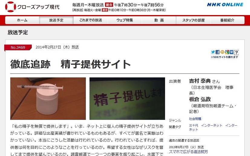 NHKキモすぎワロタwwww「徹底追及 精子提供サイト」一般人が精子提供広告→公衆便所でカップに入れた精子を手渡し 「実際に妊娠したケースもあります」|もえるあじあ(・∀・)174: 可愛い奥様 2014/02/27(木) 21:33:02.40